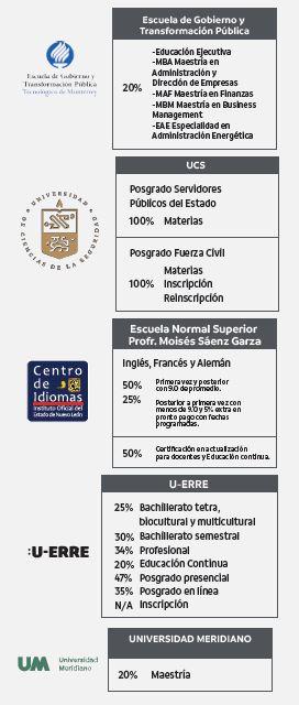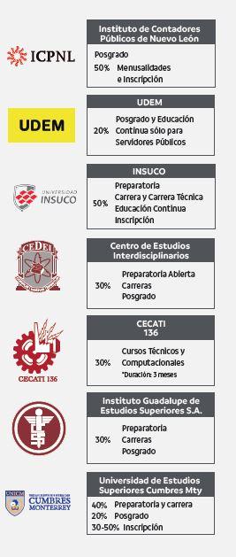 A continuación te presentamos el listado de instituciones en convenio educativo con Gobierno del Estado de Nuevo León con becas y acuerdos para los servidos públicos.